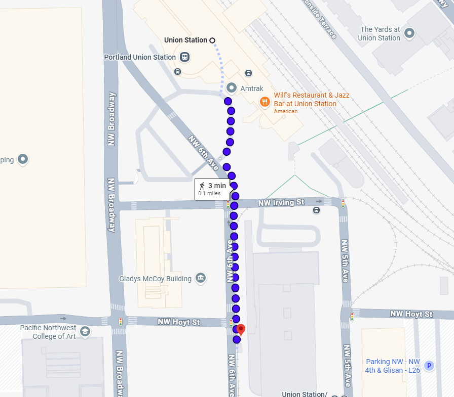 Exit the station and walk approximately one and a half blocks South on 6th Ave. until you reach the corner of 6th and Hoyt St.